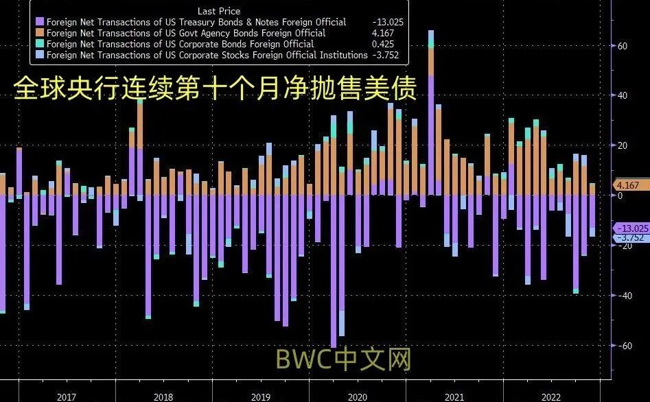 所以,按零对冲的进一步解释,美债目前的情况就是隐性违约,同时,美国还正在利用高通胀对冲其发行债务的部分成本负担,这将使得作为美债基石级别的全球央行大买家们在2023年度可能仍会继续存在大幅抛售美债的可能,最新的数据正在反馈这个趋势。