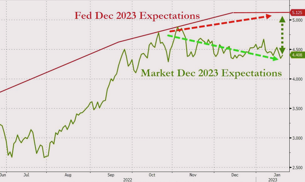 不过,分析表明,在美联储继续维持鹰派,且美联储众多理事警告美元终端利率峰值会在2023年突破5.1%且保持更长时间的预期下(请参考下图),这表明接下去的数月内,美债收益率、美元利率会攀升至5%上方,这些都预示美国国债市场将面临最大的尾部风险,料将加快了作为美债基石级别的投资者及全球央行大买家们远离或减少购买美债的速度。