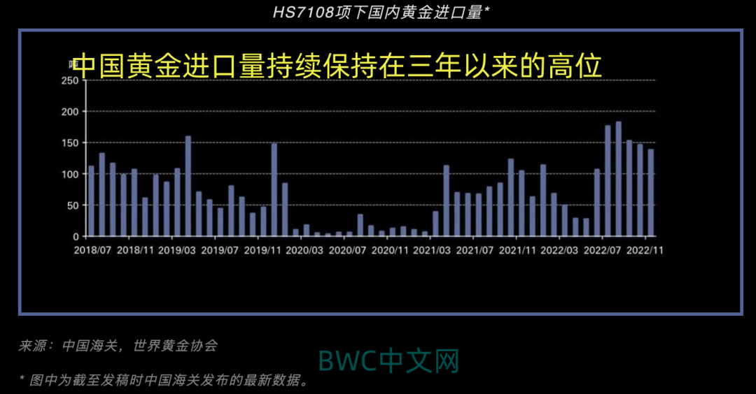 世界黄金协会在1月20日公布的数据显示,2022年前11个月,中国的黄金进口总量高达1186吨,我们注意到,中国的黄金进口量从去年第三季度开始明显加快,明显高于2019年以来的平均季度水平,更高于近三年以来的平均水平。