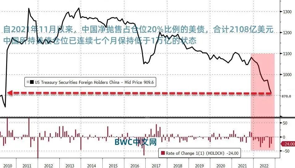 其中,中国保持连续三个月大幅抛售美债的状态,截至2022年11月的三个月内共大幅度减持了1018亿美债至8700亿美元,仓位降至十二年来的新低(具体数据细节请参考下图)。