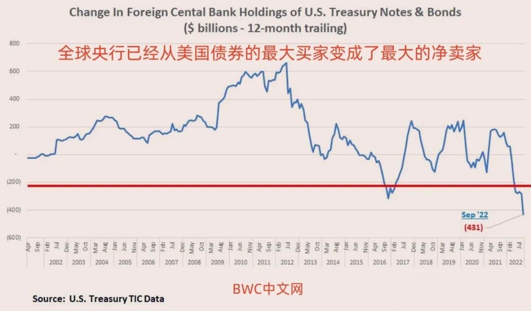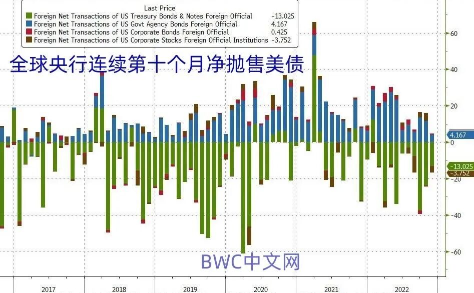 这张根据美国财政部历次公布的国际资本流动报告的数据汇总图表也在印证上述逻辑,数据显示,自2020年以来,全球央行加快完成了从美国国债和债券的最大买家变成了最大净卖家的转身,呈现减少投资或远离美债的状态。