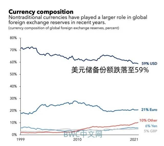 而美国国会的前议员巴斯说,“我认为一些人宁愿看到美国破产,美元崩溃,看到人们的财富一落千丈。”换言之,巴斯认为,美国债务上限或很难达成共识,最终美国会因为债务问题可能走向破产,以致美元丧失储备地位。如下图,可以看到,美元的全球储备地位已经由上世纪一度高达85%的峰值跌落至59%的低点,特别是本世纪以来美元地位已大不如从前。