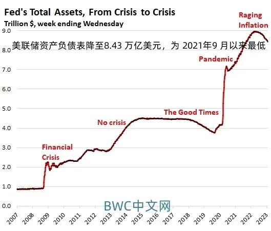 这就意味着,即使未来美国可能出现债务违约时,美联储或将呈现出袖手旁观的状态。实际上,此时的美联储也正在大手笔做空美国国债。事情的一个新变化是,美联储于2月2日公布的最新一期资产负债表显示,自2022年4月见顶以来已缩减5320亿美元资产,总资产降至8.43万亿美元,为 2021年9月以来最低。与一个月前相比,美联储的资产负债表上的总资产减少了740亿美元。