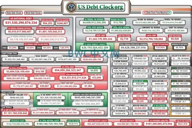 的确,如下图,这张如蜘蛛网一般密密麻麻,纵横交织的美国债务时钟显示,今天的美国经济一分一秒都离不开债务。过去数十年以来,美国经济取得的繁荣无一不是靠美国财政部向全球发行并兜售美国国债,并对冲其高企赤字才得以实现,进而也形成了美国人养尊处优的习惯。美国财政部自2020年以来,甚至多次暗示,可能在未来某个时候发行100年期的美国国债,高盛分析师更是建议,美国可以在负利率的时候,发行1000年期的美国国债。