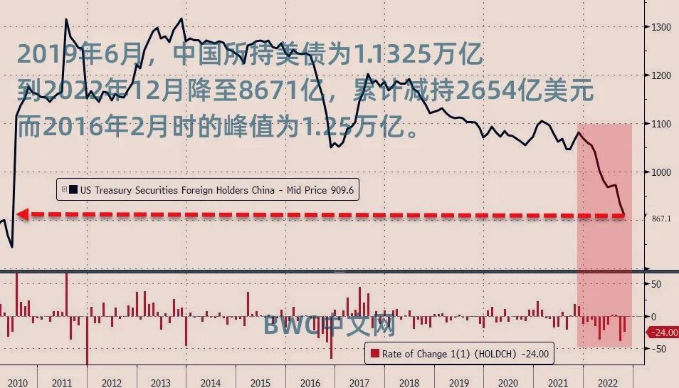 比如,正如下图所示,2019年6月中国所持美债持仓为1.1325万亿美元,到2022年12月,持仓已经持续降至0.8671万亿,累计净减持高达2654亿美元,仅去年一年就净抛售1732亿,使得持美债总量大幅度降至十二年以来的新低,且更是连续九个月保持在万亿美元规模以下,数据显示,2016年2月时的峰值为1.25万亿。