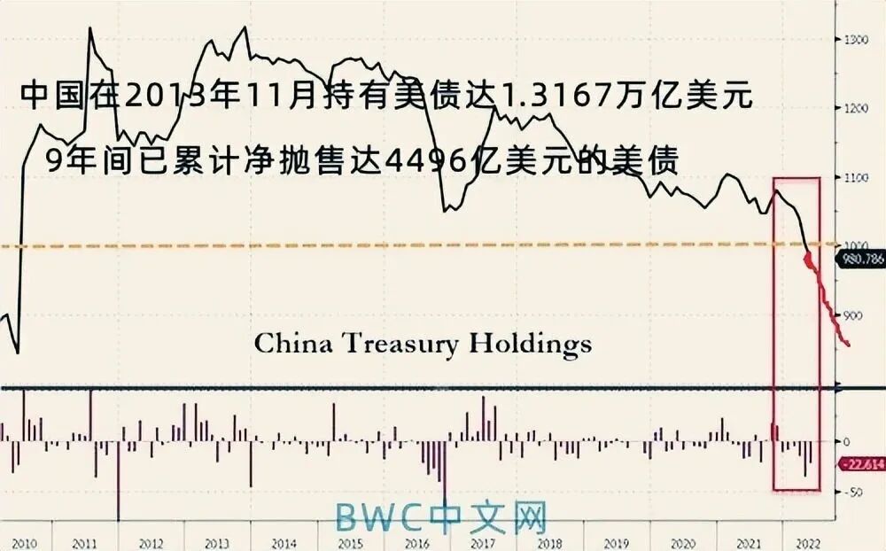 与此同时,经美国财政部数据修正后,美债的第二大持有国中国在2022年,只是在7月小幅增持美债,其他11个月都保持抛售美债的状态,全年累计净抛售美债为1732亿美元,中国的美债持仓已降至8671亿美元。而BWC中文网查询美国财政部历史数据注意到,目前的8671亿美元相比于2013年一度持有美国国债总额达1.3167万亿美元,中国在过去9年间已累计净抛售高达4496亿美元的美国国债,累计净抛售比例逾34%。