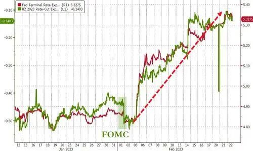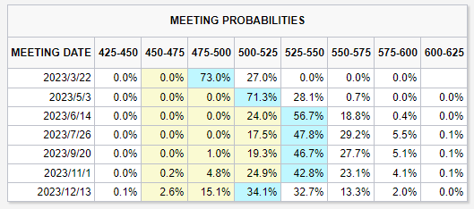 不过,市场对于2023 年下半年降息的希望破灭更为明显。在终端利率方面的预期则被认为偏鹰派立场。芝商所“美联储观察”工具显示,目前市场最主流的预测是美联储将连续在3月、5月和6月各加息25个基点,使利率范围达到5.25%-5.50%的水平。