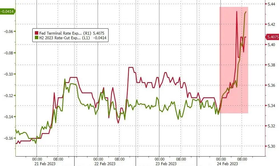 根据CME美联储观察工具的数据,目前,3月份加息50个基点的可能性从数据公布前的24%升至 35%,高于2月23日的20%,同时,对美联储最终利率的预期已飙升至5.45%,而2023年下半年的降息预期的概率已接近于零。