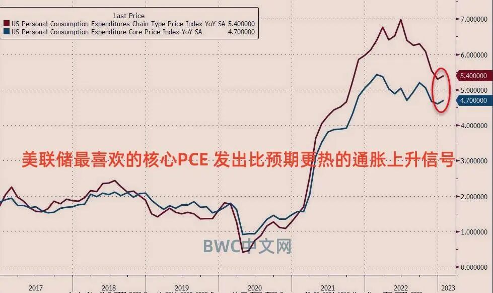 2月24日美国经济分析局最新公布的近两年来最强劲的美国消费者支出数据显示,美联储偏爱的通胀指标个人消费支出价格指数 (PCE) 在1月份意外跃升至5.4%,而预期认为将从前值5.3%降至5.0%,这令人质疑美联储在通胀斗争中仍处于落后状态。