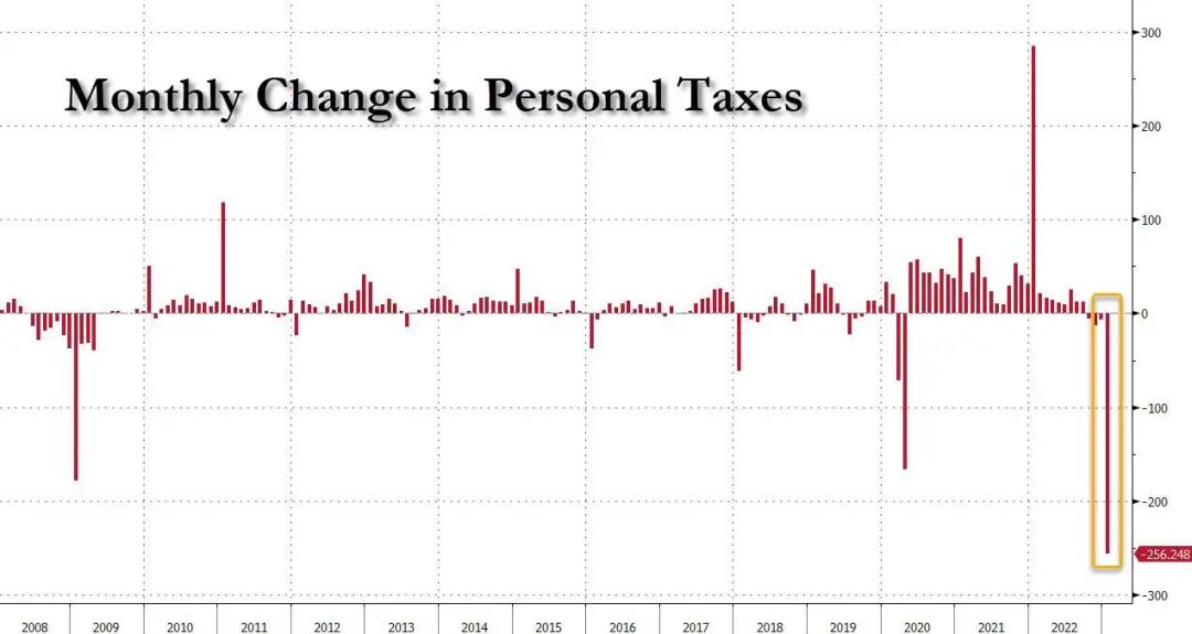 美国经济分析局在2月25日发布的报告也在印证美国经济的衰退预期,报告显示,美国1月份税收大幅降至2560亿美元,且是美国历史上最大的降幅,超过了2020年3月新冠蔓延时和2009年1月美国金融危机崩盘时的暴跌幅度。