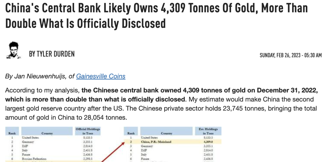 紧接着,美国金融网站零对冲在2月26日援引贵金属研究机构Gainesville Coins的报告分析称,中国可能拥有4,309吨黄金储备,是官方披露的两倍多。