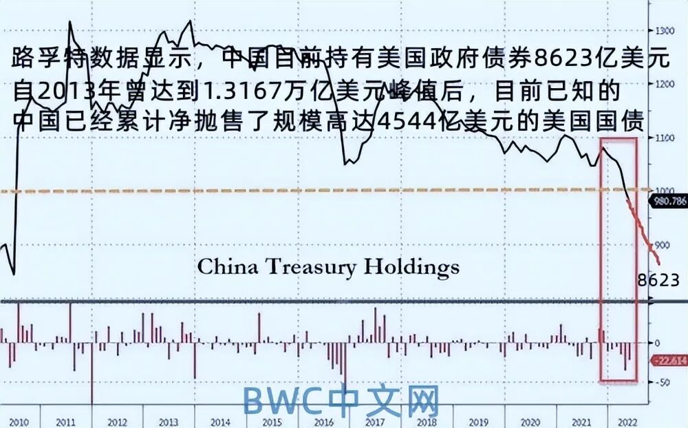 而根据数据分析机构路孚特2月26日追踪到的最新数据,中国目前持有的美国政府债券总额为8623亿美元,为13年以来最低。相比于2013年持有美债曾高达1.3167万亿美元峰值,近10年间,中国已累计净抛售了规模高达4544亿美元的美国国债,累计净抛售比例高达34.5%。并且早已连续数月都不再是美债最大的持有国。