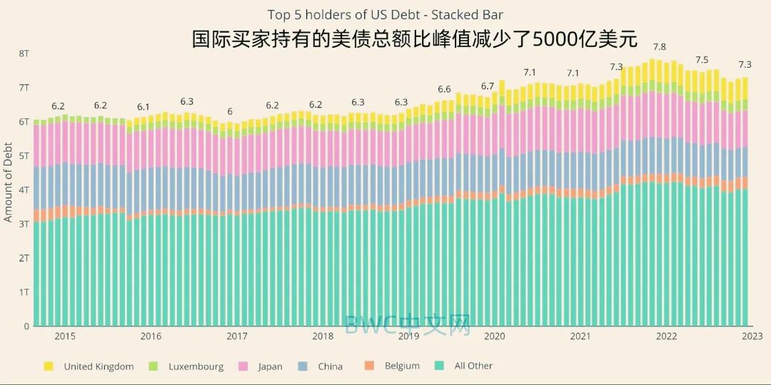 而今天,美国经济、金融和美元无处不在的霸权使越来越多的国家开始远离美债等美元类核心资产已经不可避免。例如,世界黄金协会的报告显示,2022年全球央行的购金量高达1,136吨,创下有该数据记录以来新高。与此同时,如下图,可以看出,全球央行去年一年已经较高峰时,净抛售了至少5000亿美元的美国国债。