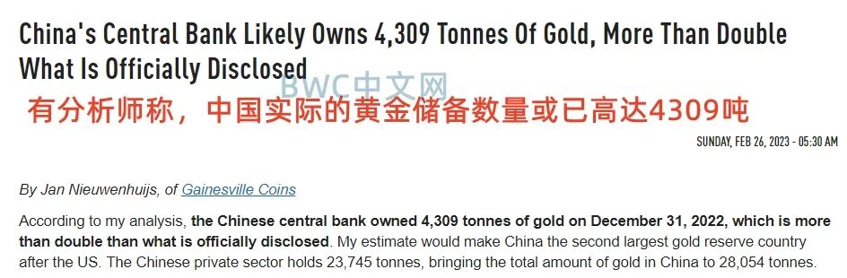 不过,美国金融分析机构零对冲2月26日援引盖恩斯维尔硬币公司的 黄金观察家尼文惠斯(Jan Nieuwenhuijs)分析称,截至去年年底时,中国实际的黄金储备数量或已高达4309吨,比人们知道的多一倍。与此同时,尼文惠斯称,中国民间机构等持有黄金约23,745 吨,或使中国黄金总量达到约 28,054 吨。