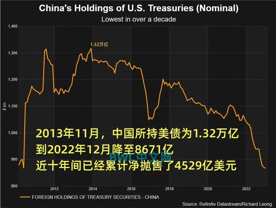 据美国财政部和路孚特公司最新公布的数据显示,中国在2022年度大幅清算了高达17%仓位的美债,使得持仓规模加速降至十二年以来的新低至8671亿美元,而从更长远的时间范围来看,和中国在2013年11月时所持有的1.32万亿的峰值相比,截至今年1月,已经净抛售了高达4529亿美元的美债。