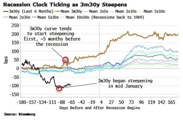 现在的美国经济,真是屋漏偏逢连夜雨,病态中的美国经济正面临着一场重大的压力测试,3月7日,两年期和10年期美债收益率的利差倒置程度进一步加深,报-91.14个基点,同时,更为关键的3个月期和30年期限的美债收益率的利差曲线在今年1月首次出现倒挂后,目前重新变陡,通常该曲线变陡加剧往往会在经济衰退前的五个月时出现,这表明美国最早可能会于6月进入衰退。