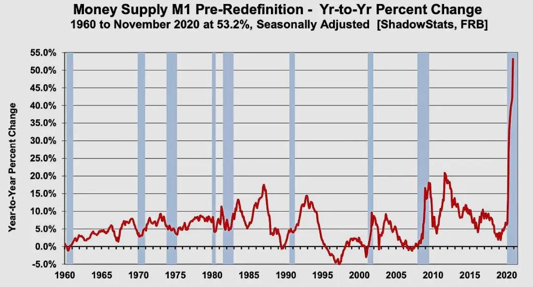 显然,美联储在其货币政策工具接近倾家荡产,不得不求助政府提供更多的刺激。美国正将这些庞大的数十万亿美元债务进行货币化,如您所见,美国M1在2020年增长了50%以上,下图中的这根几乎垂直的红色大直线完美的诠释了这个过程。