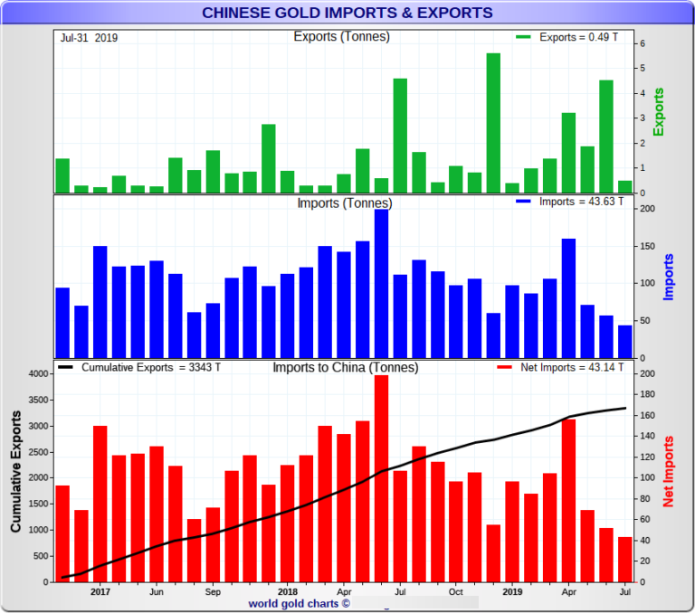 与此同时,包括外媒和国际黄金分析第一人阿拉斯代尔麦克劳德也猜测认为,中国在1982到2003年间囤积了2.5万吨黄金,而目前很有可能超过3万吨。这些观点,我们可以通过中国大妈在过去数十年间至今,对黄金的热爱程度上就能得到间接说明问题。下面三张数据图显示了研究机构估计1994年至2019年中国市场的黄金持有总量、2017年1月– 2019年间中国每月黄金进出口数据和2008年至2019年间上海黄金期货交易所SGE黄金交易趋势年度数据趋势图。