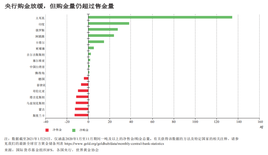 而这背后体现的正是,虽然,美国在50年前单方面宣布将黄金赶出了国际货币体系,但作为非美元国家的全球央行们依然在继续购买和扩大持有黄金储备,且呈现出持续趋势。世界黄金协会的数据显示,虽然,目前全球央行购金速度较前二年出现明显放缓,但纵观2020年,全球央行净购买黄金的数量仍旧继续超过卖黄金的央行数量。