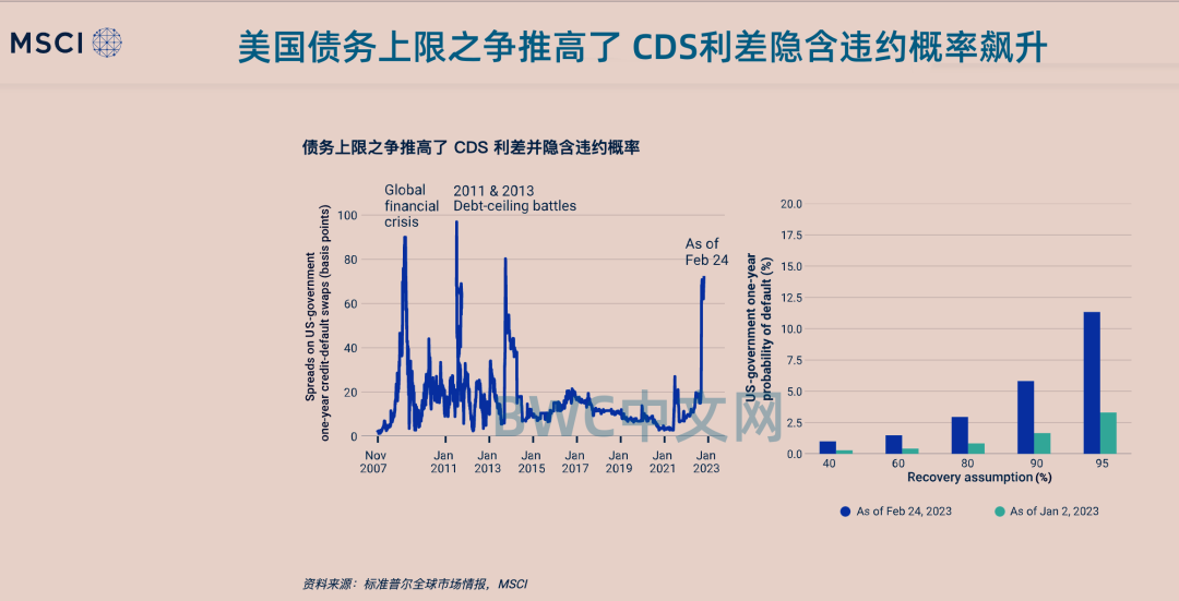 紧接着,美国投资研究公司MSCI在3月10日最新更新公布的一份报告指出,目前,防止美国违约的信用违约互换交易量出现飙升。据MSCI称,自年初以来,基于CDS定价的美国违约隐含概率增加了两倍多,达到自2013年债务上限辩论以来的最高水平,这证明了投资者对美国债务上限的担忧日益增加,美国在面临金融经济灾难的同时,也面临着信用灾难的威胁。
