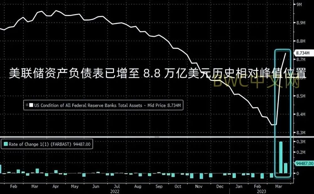 不过,这一次,受美国银行业危机的推动,美联储主席鲍威尔在3月22日透露了一个关键细节,那就是美联储的官员们考虑暂停加息。与此同时,截至3月23日,美联储发放给倒闭银行的贷款金额已从上周的 1428 亿美元飙升至 1798 亿美元。这使得美联储整体资产负债表规模已增至 8.8 万亿美元的历史相对峰值位置。