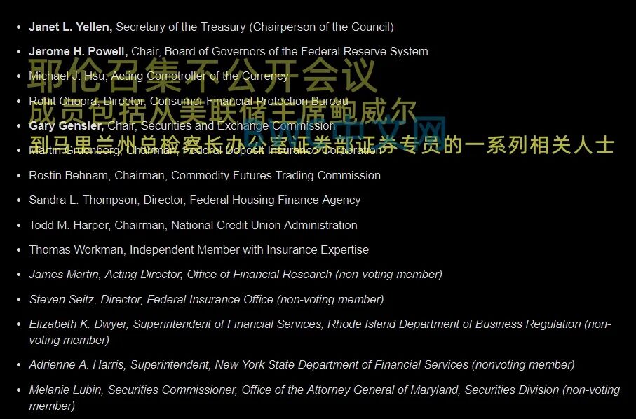 迹象表明,美欧银行业依然深陷危机的魔咒。一个关键信号是,美国财长耶伦在美东时间3月25日以紧急视频会议方式召集了美国金融稳定监督委员会(理事会)的执行会议。如下图,可以看到,与会人员包括了从美联储主席鲍威尔到马里兰州总检察长办公室证券部证券专员的一系列相关人士……