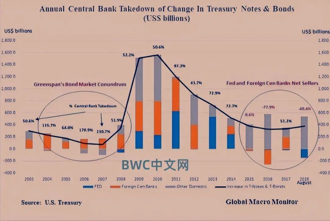 从更长远的时间范围来看,截至2023年二月份的十二年内,全球央行的购金总量高达6,940吨,尤其是近几年购金节奏进一步加快,在外储中去美元化的趋势十分明显,正如世界黄金协会和IMF为我们提供的最新数据所示,自2008年美国推出数轮量化宽松以来,全球央行的美债持有总量并没有和美国大放水印钞的数量成正比例增长关系,这和他们黄金储备的飙升形成了鲜明的对比。