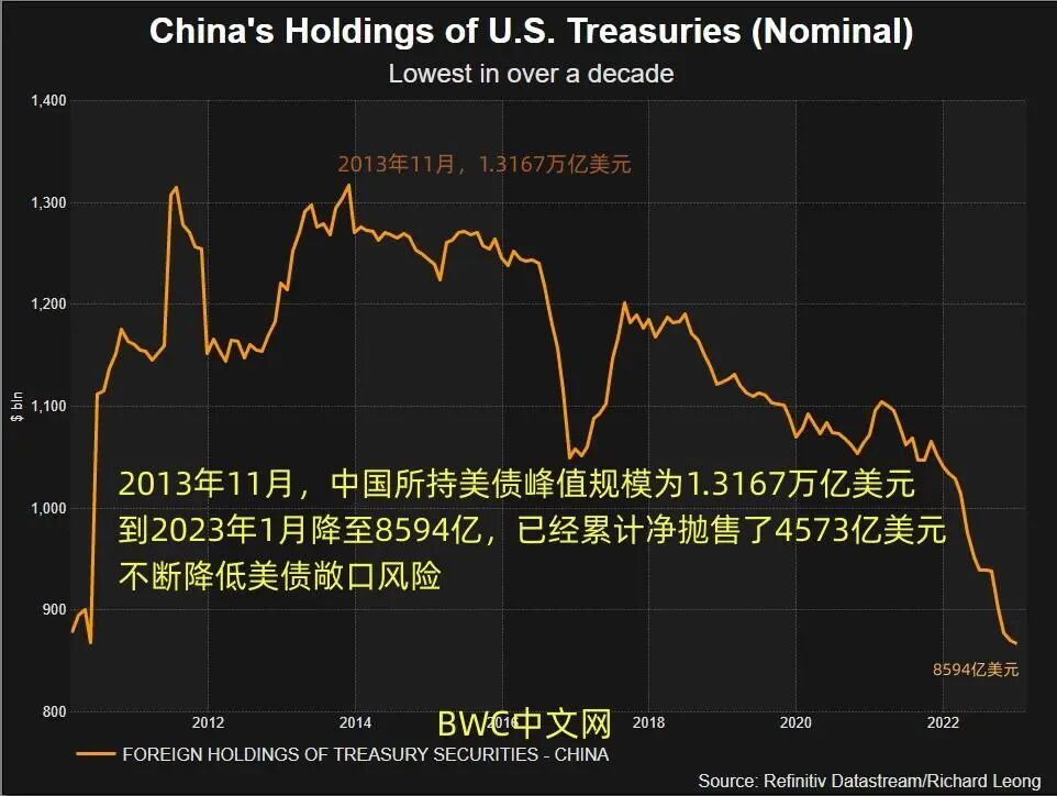 数据显示,2022年1月至今年1月底,中国在保持连续增持黄金储备的同时,也加速清算了占比高达17%仓位的美债,且在过去的13个月中有12个月是在净抛售美债,且中国所持有的美债总量已经创下了连续四个月低于9000亿美元的纪录,和2013年11月时创下1.3167万亿美元的持仓峰值相比更是净抛售了4573亿美元的美债,累计净抛售比例近35%,以降低美元敞口,并正在推动让人民币资产在全球发挥更大作用的进程。