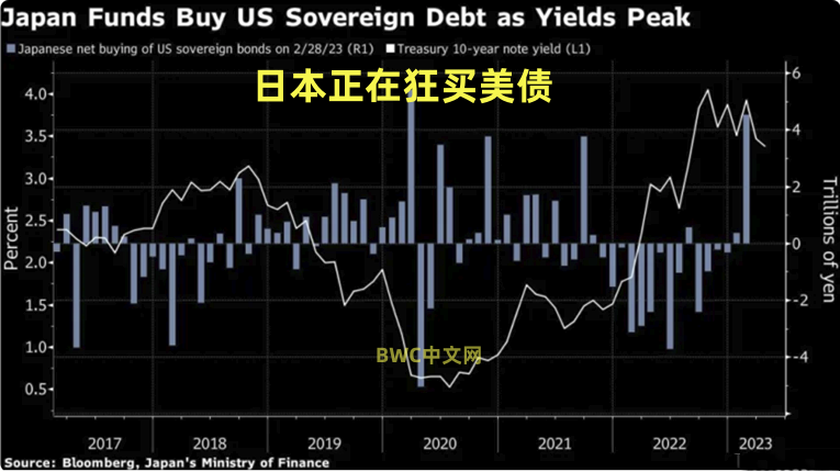 据日本央行在4月10日公布的一份国际收支数据显示,日本正在狂买美债,净买入金额从1月份的3574亿日元升至4.52万亿日元,约341亿美元,且创下2020年3月以来的最高月度购买量,似乎日本新上任的央行行长正在向美国交投名状,并为身处继续加息抗通胀还是避免美国经济衰退困境中的美联储因持续缩表而让美债市场陷入流动性萎缩和信贷紧缩接盘。