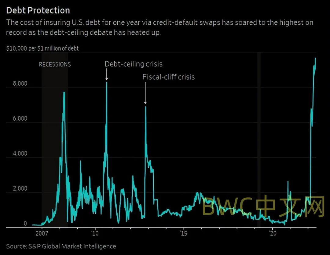 截至4月22日,用于衡量美国国债违约可能性的美国一年期信用违约掉期(CDS)达到十年来最高水平。从金额上来看,投资者愿意每年支出9600美元来为100万美元的美债投保,超过2011年和2013年美国联邦债务赤字困境时的水平。更是达到今年年初1400美元的近7倍。