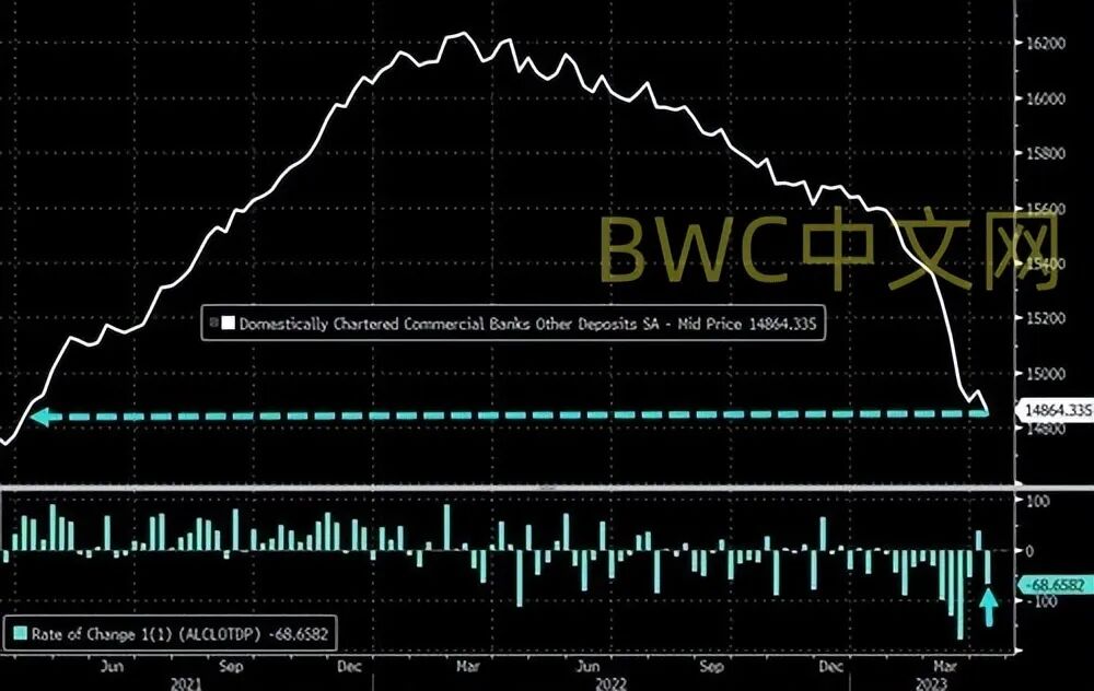 此外,美联储4月21日发布的最新报告显示,仅截至4月12日结束的一周内,美国的商业银行存款(超大型定期存款)意外恢复自由落体走势,暴跌 686.6 亿美元,为2021年4月以来最低水平。