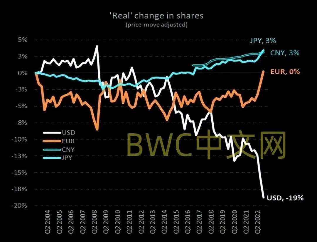 而通过下图,可以看到,按实际价值计算,美元的市场份额从 2003 年占全球总储备的约三分之二已经下降到 2021年的约55%。 并且到了2022 年时,美元的份额急剧下降至全球总储备的 47%,一年内出现8%的跌幅,相当于美元全球份额以过去几年10倍的速度大跌。