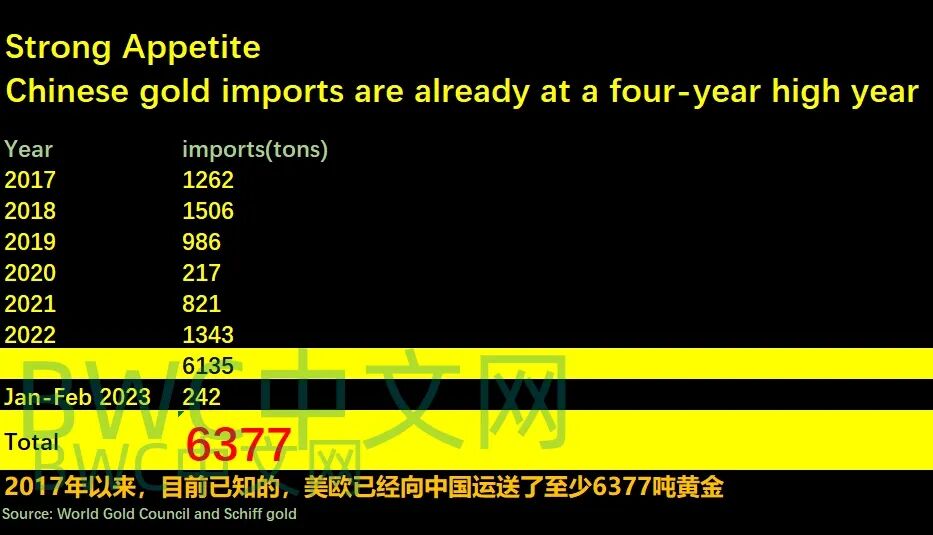 与此同时,在市场交易层面,根据美国金融机构Schiffgold通过查询海关数据称,中国2 月进口了 166 吨黄金,这比 1 月的 76 吨显著增加,也就是说,仅今年前两个月,美欧市场就向中国运送了242吨黄金。而根据世界黄金协会的数据显示,自2017年至2022年的6年间,中国买家共进口 6135吨黄金。再叠加今年的数据,相当于2017年以来,目前已知的,美欧已经向中国运送了至少6377吨黄金。