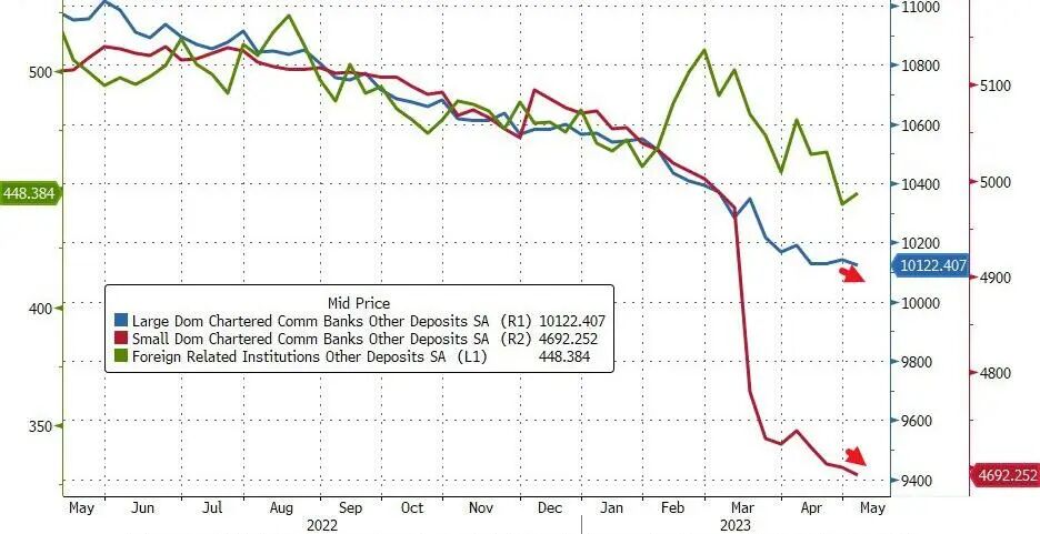 与此同时进行的是,美国银行存款继续外流,特别是小银行的贷款更是出现崩溃,让市场更担忧的是大银行的存款撤离规模比小银行更明显。