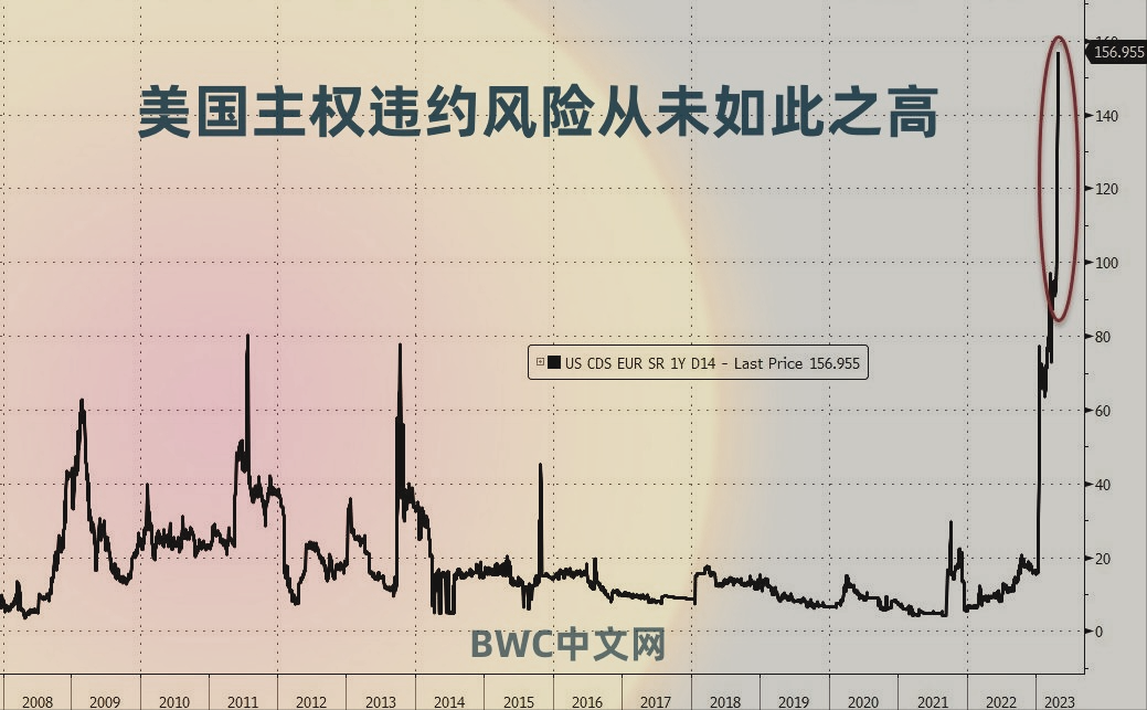 根据美国评级机构标普的数据,用于衡量美国违约风险的指标一年期信用违约互换(CDS)利差扩大到176个基点,创历史新高,同时,五年期信用违约互换利差也达到2009年以来的最高水平。