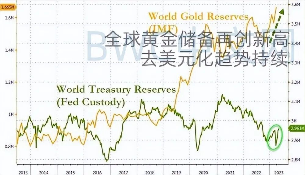 也正是美国债务经济模式和美元的一系列不可靠的迹象,催化了全球央行加速增持黄金储备的进程。如下图,全球央行增加的黄金储备再创历史新高。
