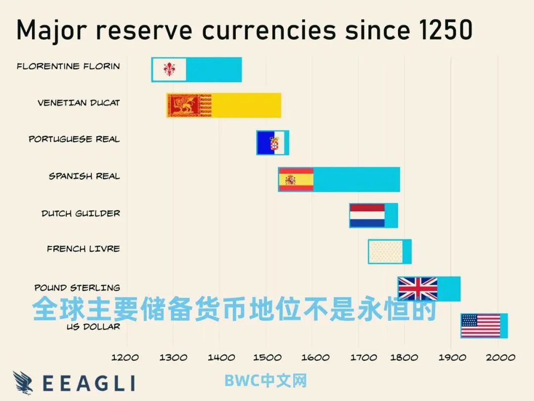 同时,对于研究货币历史的人来说,这并不是什么新鲜事,正如下图所示,自1450年以来,有六个主要储备货币期,最早由葡萄牙主导了全球储备,直到1530年西班牙变得更强大,在17世纪和18世纪的大部分时间里,荷兰和法国发行的货币主导了世界贸易,但大英帝国的出现使英镑成为储备货币。
