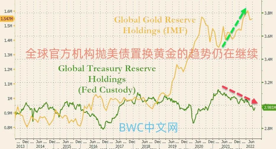 同时,由世界黄金协会和IMF为我们提供的最新数据也在验证上述逻辑,正如下图所示,近几年以来,随着全球央行美债持有量下降,全球央行的黄金储备却飙升至历史新高,以对冲美债敞口风险。