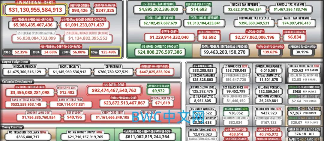 目前,不可持续增长的美国债务仅在过去十年就翻了一番,在6月23日已经超过32万亿美元,占GDP的124%以上。如此庞大的债务增加了美国最终无法偿还债务的风险。