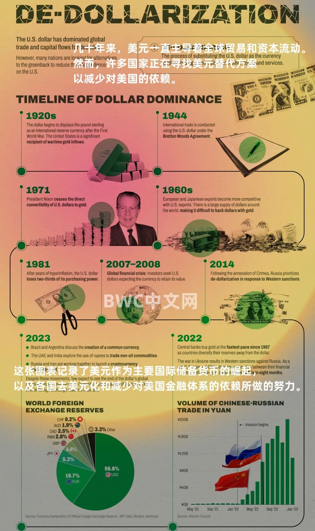所以,仅从这个角度来看,维护美元的主要货币地位对于美国的重要性不言而喻,因为,货币的溃败往往先于国家的衰落,这张图表详细的记录了美元作为全球主要国际储备货币的崛起,以及最近几个月以来,各国为去美元化和减少对美国金融体系依赖所做的努力。