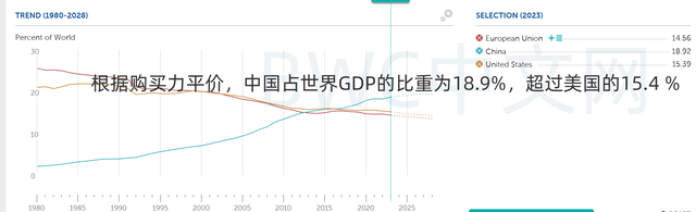 虽然中国经济总量2022年为18万亿美元,美国为25.5万亿美元。但在购买力方面,国际货币基金组织的数据显示,根据购买力平价(PPP),中国占世界GDP的比重为18.9%,超过美国的15.4 %。