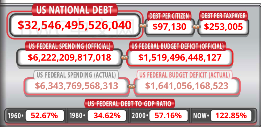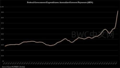 这对美国来说将是一场彻底的灾难,意味着美国32.5万亿美元债务总额的利息支付将在12个月内达到至少1.3万亿美元,有可能使债务利息成为美国政府最大的单一支出,并超过社会保障。