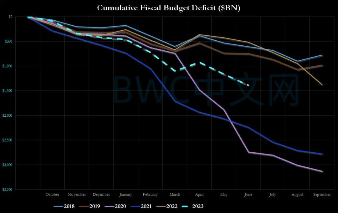 由于每月赤字高于预期,也远高于一年前,因此在截至今年6月的美国本财年 9 个月的累计赤字已经是有记录以来的第三高,仅次于美国金融危机的年份。与此同时,2022 财年年初至今赤字达 1.393 万亿美元,与去年同期相比已增加 170%。