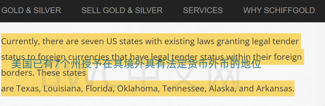 而事情的最新进展是,美国金融咨询机构Schiffgold7月14日的消息显示,目前,美国已经有7个州的现行法律授予在其境外具有法定货币外币的地位。分别是,德克萨斯州、 路易斯安那州、 佛罗里达州、 俄克拉荷马州、 田纳西州、 阿拉斯加州和 阿肯色州。