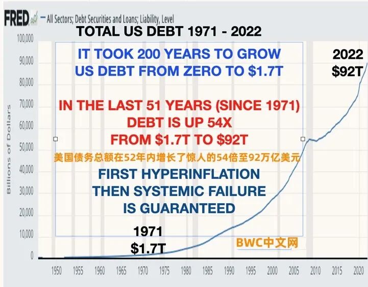 因为,现在的美元是建立在庞大的联邦债务赤字纸牌屋之上的,大部分的美元是锚定美债扩张边界发行的,没有黄金支持,很明显,现在的美国债券已经资不抵债,只有被高估的美元在苦苦支撑,正如下图数据所示,自1971年以来,美国总债务增长了53倍,而GDP仅增长了22倍。