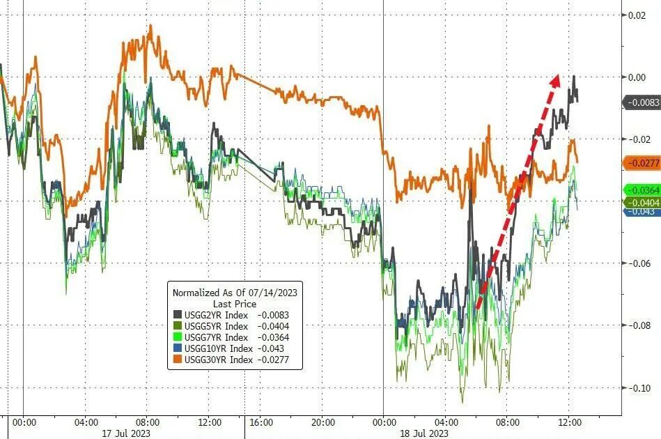 因为,美国激进的货币政策给美债带来流动性萎缩和关键收益率曲线创下23年以来最严重倒挂,给市场带来抛压,这就是为什么会看到外国资金目前还在持续撤离的原因,摩根大通在7月17日对全球客户的最新调查显示,美债净空头头寸已升至2017年12月以来第三高水平,自2023年6月初以来,基准10年期美债已上涨32个基点,债券收益率与价格成反比,收益率上涨代表抛售量大于购买量。