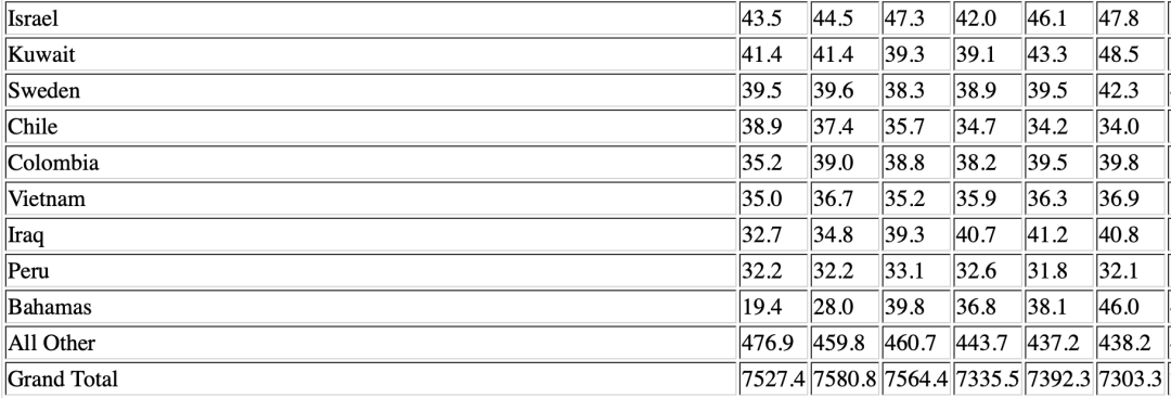 而从更长远的时间范围来看,和2013年11月时所创下的1.3167万亿的持仓峰值相比,中国更是净抛售了4700亿的美债,累计净抛售比例近35%,目前中国仍为第二大海外美债债主,具体数据细节请参考下图。