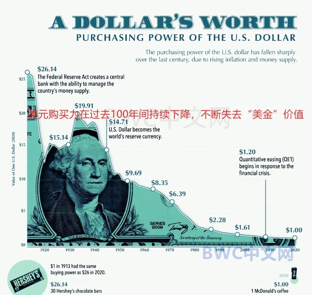 而截至7月20日,在美国,至少43个州已经相继免除金银销售税,这都为美国越来越多的州走上将金银恒定货币重新推向前台,及货币独立之路奠定基础。如下图,过去一百年间,美元已经失去了97%以上的购买力。特别是上世纪70年代,尼克松单方面废除1944年的布雷顿森林体系金本位,将美元与黄金脱钩以后,美元的购买力快速呈现断崖下跌状态。