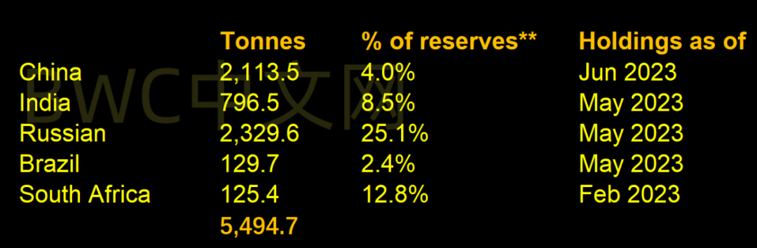 我们综合世界黄金协会的报告统计到,目前公开的数据显示,金砖5国的黄金储备总量为5494.7吨,市值约为3500亿美元,并且分别在外汇储备中的占比也远远低于欧洲国家的黄金储备占比。也就是说,从公开的黄金储备总量上来看,可能发行“金砖币”的数量并不会过于庞大。