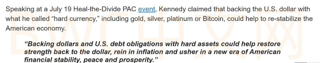 简单来讲,小罗伯特·F·肯尼迪的核心观点是,过去半个多世纪以来,已脱离金本位的美元和美国国债并非真正意义上的货币,而是由美联储和美国财政部操控下的印钞机的产物。而将美元与黄金等资产重新挂钩,可以保持美国货币的稳定和长期价值。